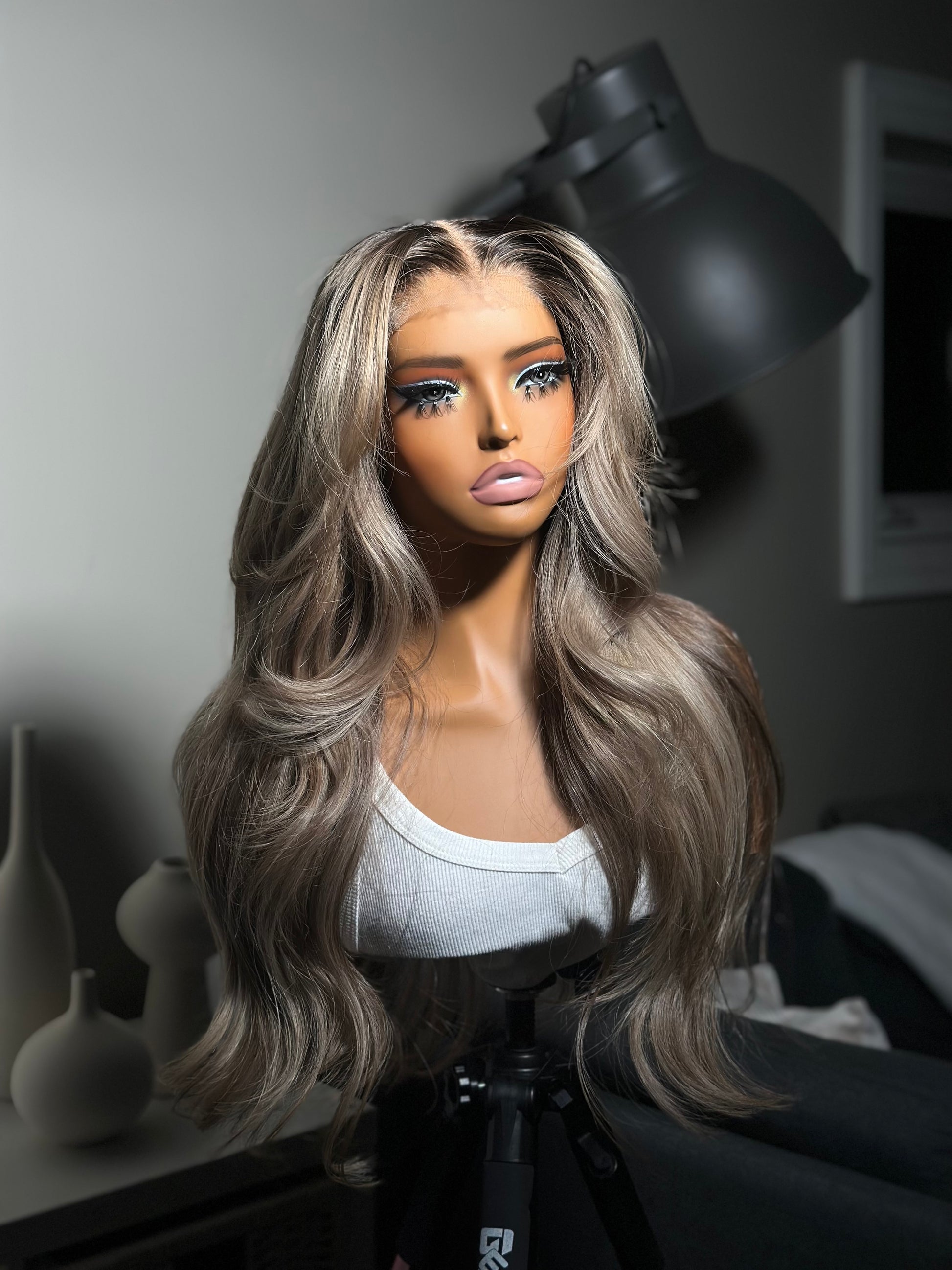 Color: Mushroom lowlights, natural ash lowlights, icy blonde highlights, dark natural root.